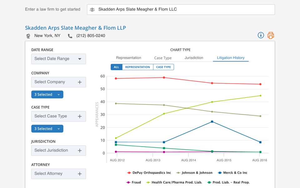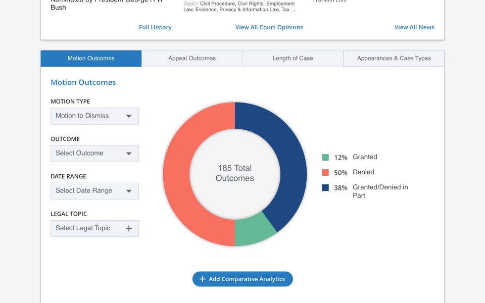 Consulting with attorneys and other legal researchers, we established which graphs and filters would yield valuable analysis and insights for this persona.