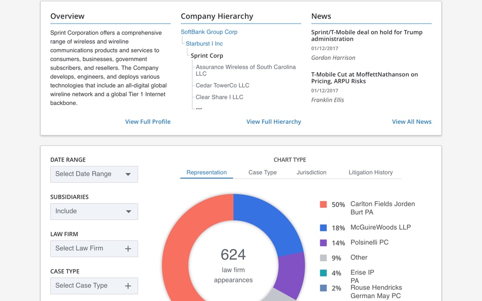 Once we shipped on the MVP I turned my focus to the remaining entity types: companies, law firms, and attorneys - all of which possessed their own nuances and unique modes required to provide valuable insights from the data.