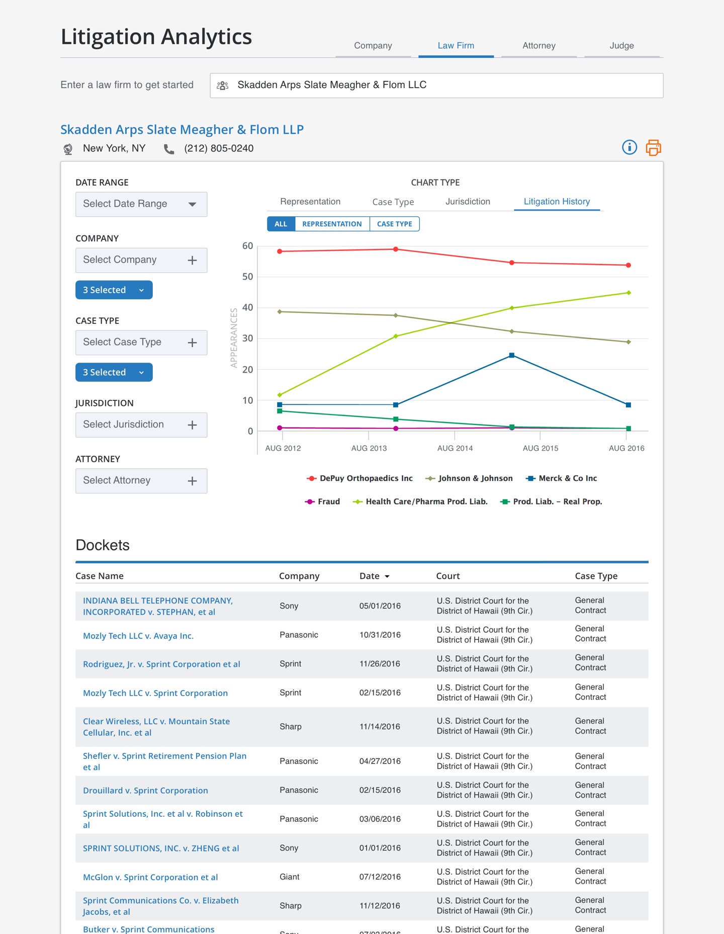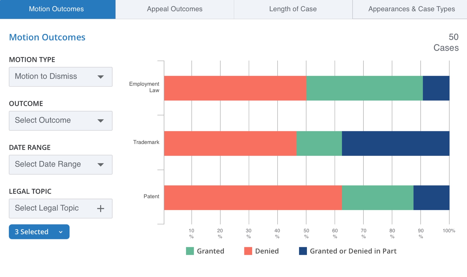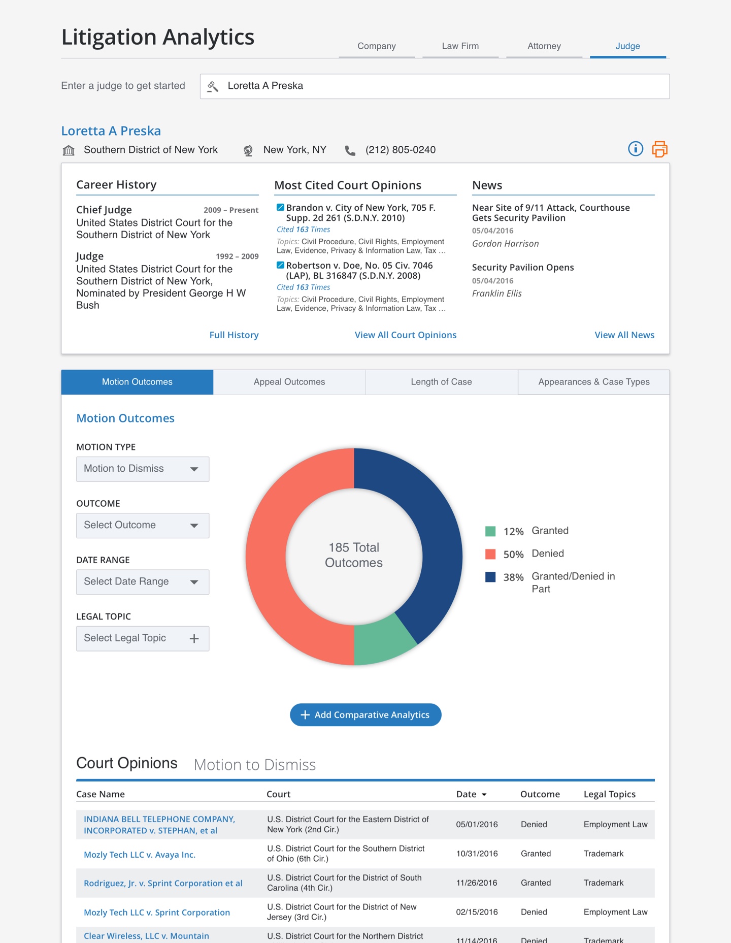 Consulting with attorneys and other legal researchers, we established which graphs and filters would yield valuable analysis and insights for this persona.